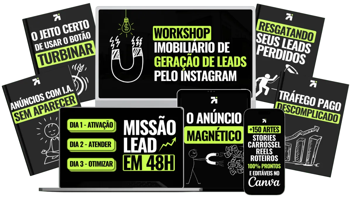 Modelos de conteúdo para Instagram ("Feed Magnético™" e "Stories Invisíveis™"), projetados para construir autoridade e gerar desejo de forma sutil, sem a necessidade de o corretor aparecer constantemente nos vídeos ou criar conteúdo diário.